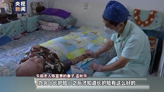 失能老人陳富景的妻子 孟秋華:護(hù)理員一來就幫他揉,我就輕松多了,白天來的好幾個小時我能休息,辦完長護(hù)險后才知道長護(hù)險這么好,又解決家庭經(jīng)濟(jì)困難,還有人幫著照顧,我說老頭子有救了。