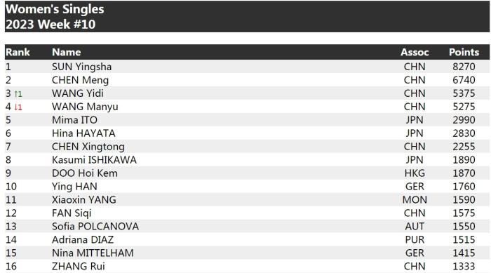 女單方面,孫穎莎以8270分領(lǐng)先,穩(wěn)居第一,陳夢6740分位居第二,王藝迪5375分位列第三,王曼昱排名第四。日本選手伊藤美誠以2990分排在第五位。
