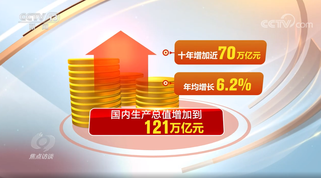 這五年,我國(guó)經(jīng)濟(jì)發(fā)展再上新臺(tái)階。國(guó)內(nèi)生產(chǎn)總值增加到121萬億元,五年年均增長(zhǎng)5.2%,十年增加近70萬億元、年均增長(zhǎng)6.2%,在高基數(shù)基礎(chǔ)上實(shí)現(xiàn)了中高速增長(zhǎng)、邁向高質(zhì)量發(fā)展。