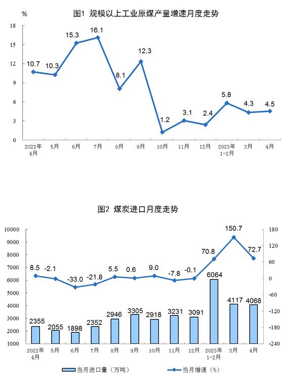 原煤、原油和天然氣生產(chǎn)及相關(guān)情況。原煤生產(chǎn)穩(wěn)步增長(zhǎng),進(jìn)口持續(xù)大幅增加。4月份,生產(chǎn)原煤3.8億噸,同比增長(zhǎng)4.5%,增速比3月份加快0.2個(gè)百分點(diǎn),日均產(chǎn)量1272萬噸。進(jìn)口煤炭4068萬噸,同比增長(zhǎng)72.7%,增速比3月份回落78.0個(gè)百分點(diǎn)。