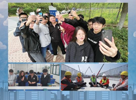 95后汪澤偉(上圖中間黑色衣服,左下圖右二)和00后王檜耀(右下圖右二)“身份互換”后的場(chǎng)景。中鐵四局、安徽建筑大學(xué)供圖