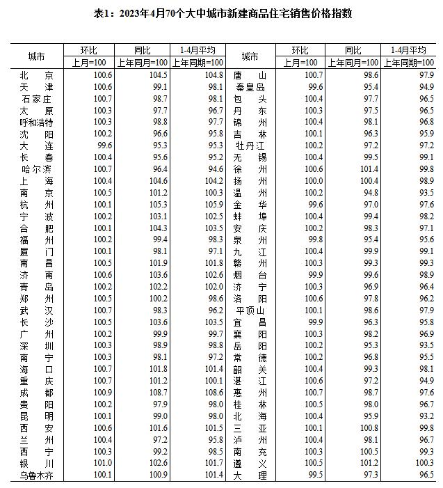 中新網(wǎng)5月17日電 國家統(tǒng)計局網(wǎng)站17日發(fā)布2023年4月份70個大中城市商品住宅銷售價格變動情況,國家統(tǒng)計局城市司首席統(tǒng)計師繩國慶解讀表示,2023年4月份,70個大中城市中商品住宅銷售價格環(huán)比上漲城市個數(shù)減少,同比上漲城市個數(shù)增加。70個大中城市商品住宅銷售價格環(huán)比整體漲幅回落、二手住宅環(huán)比漲幅回落更為明顯,各線城市商品住宅銷售價格同比上漲或降勢趨緩。