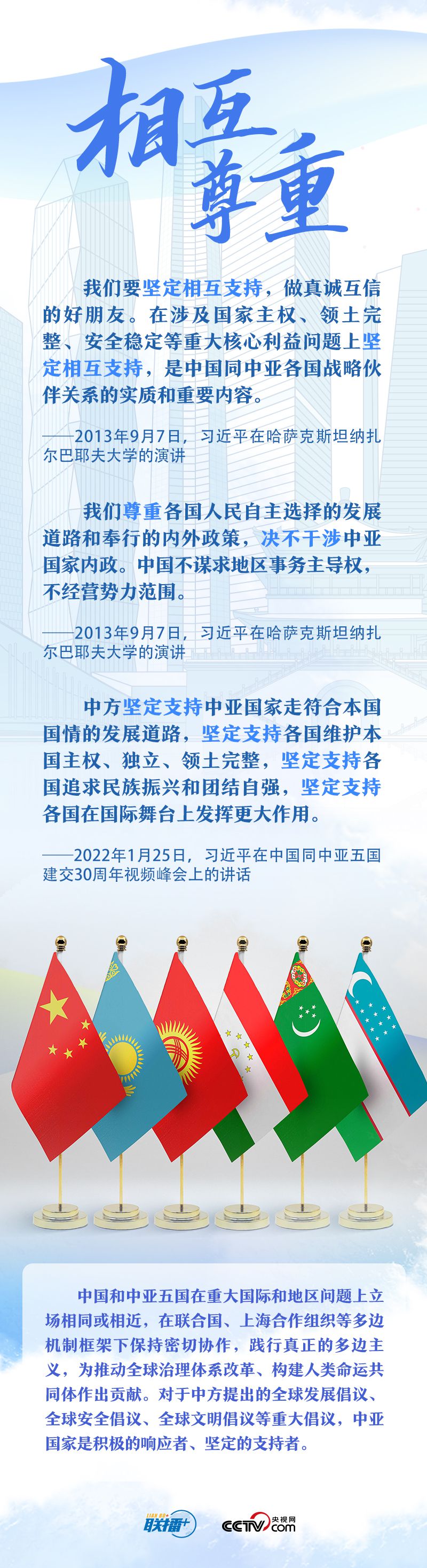習(xí)主席把中國同中亞五國合作的成功密碼總結(jié)為“相互尊重、睦鄰友好、同舟共濟(jì)、互利共贏”。他強(qiáng)調(diào),這四項(xiàng)原則是在合作中積累的寶貴經(jīng)驗(yàn)和共同財(cái)富,是中國同中亞國家關(guān)系行穩(wěn)致遠(yuǎn)的政治保障,也是中國同中亞國家友好交往繼往開來的力量源泉。央視網(wǎng)《聯(lián)播+》與您一起學(xué)習(xí)。