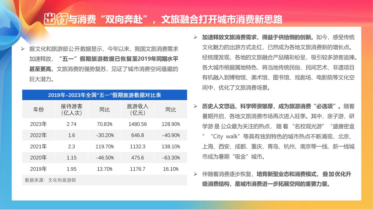 在出行方面,感受傳統(tǒng)文化魅力的出游方式走紅,已然成為各地文旅消費(fèi)新的增長點(diǎn)。隨著暑期開啟,各地文旅消費(fèi)市場再次進(jìn)入旺季。其中,親子游、研學(xué)游是公眾最為關(guān)注的熱點(diǎn)。伴隨著消費(fèi)逐步恢復(fù),培育新型業(yè)態(tài)和消費(fèi)模式,疊加優(yōu)化升級消費(fèi)結(jié)構(gòu),是城市消費(fèi)進(jìn)一步拓展空間的重要力量。