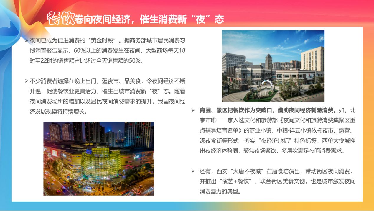 在餐飲消費(fèi)方面,隨著夜間消費(fèi)場所的增加以及居民夜間消費(fèi)需求的提升,我國夜間經(jīng)濟(jì)發(fā)展規(guī)模將持續(xù)增長。例如,北京市唯一一家入選文化和旅游部《夜間文化和旅游消費(fèi)集聚區(qū)重點(diǎn)輔導(dǎo)培育名單》的商業(yè)小鎮(zhèn),中糧·祥云小鎮(zhèn)依托夜市、露營、深夜食街等形式,構(gòu)建了“商圈+生活圈+夜經(jīng)濟(jì)”的消費(fèi)重地,榮獲北京十大商業(yè)品牌、消費(fèi)季品牌榜“十大文化消費(fèi)地標(biāo)”。西安“大唐不夜城”在唐食坊演出,帶動街區(qū)夜間消費(fèi),并推出“演藝+餐飲”,聯(lián)合街區(qū)美食文創(chuàng),也是城市激發(fā)夜間消費(fèi)潛力的典型?!秷蟾妗氛J(rèn)為,隨著夜間消費(fèi)場所的增加以及居民夜間消費(fèi)需求的提升,我國夜間經(jīng)濟(jì)發(fā)展規(guī)模將持續(xù)增長。