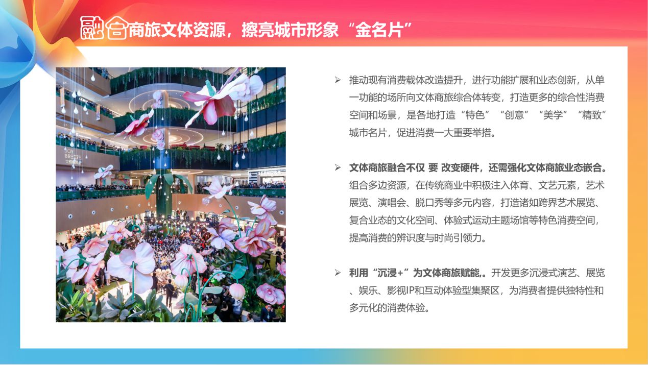 《報告》認(rèn)為,推動現(xiàn)有消費(fèi)載體改造提升,進(jìn)行功能擴(kuò)展和業(yè)態(tài)創(chuàng)新,從單一功能的場所向文體商旅綜合體轉(zhuǎn)變,打造更多的綜合性消費(fèi)空間和場景,是各地打造“特色”“創(chuàng)意”“美學(xué)”“精致”城市名片,促進(jìn)消費(fèi)一大重要舉措。