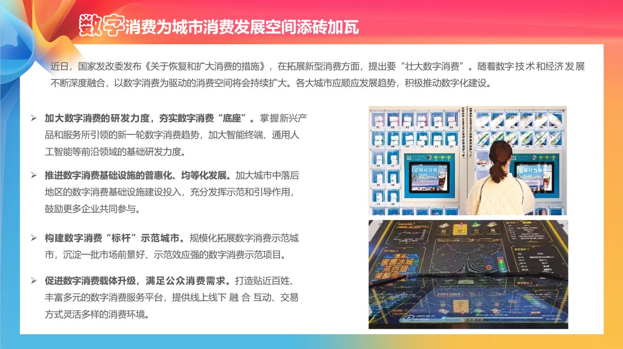 隨著數(shù)字技術(shù)和經(jīng)濟(jì)發(fā)展不斷深度融合,以數(shù)字消費(fèi)為驅(qū)動的消費(fèi)空間將會持續(xù)擴(kuò)大?!秷蟾妗方ㄗh,各大城市應(yīng)順應(yīng)發(fā)展趨勢,積極推動數(shù)字化建設(shè)。規(guī)模化拓展數(shù)字消費(fèi)示范城市,沉淀一批市場前景好、示范效應(yīng)強(qiáng)的數(shù)字消費(fèi)示范項(xiàng)目。打造貼近百姓、豐富多元的數(shù)字消費(fèi)服務(wù)平臺,提供線上線下融合互動、交易方式靈活多樣的消費(fèi)環(huán)境。(人民網(wǎng)-北京頻道)