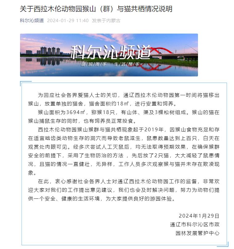 中新網(wǎng)1月29日電 據(jù)內(nèi)蒙古通遼市科爾沁區(qū)融媒體中心微信公眾號(hào)消息,通遼市科爾沁區(qū)市政園林發(fā)展管護(hù)中心29日發(fā)布《關(guān)于西拉木倫動(dòng)物園猴山(群)與貓共棲情況說明》(下稱“情況說明”)。情況說明顯示,通遼西拉木倫動(dòng)物園已第一時(shí)間將貓移出猴山,且貓的情況一直健壯,無異樣,工作人員多次觀察猴與貓并未存在欺凌現(xiàn)象。全文如下: