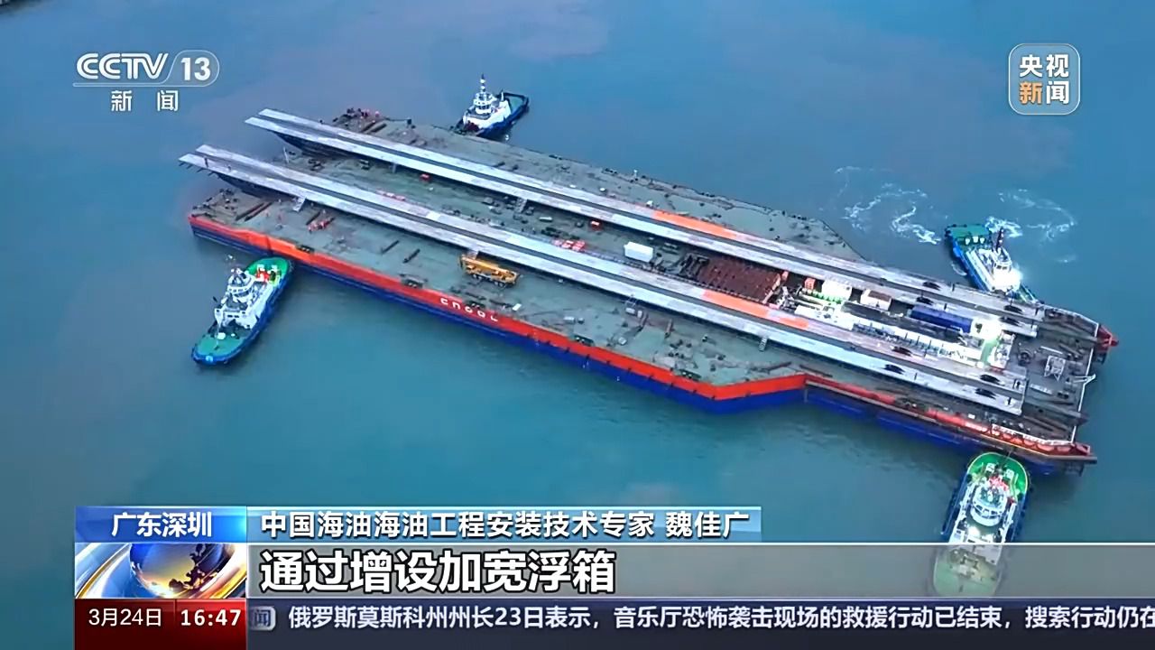 總臺(tái)央視記者 古峻嶺:這里是位于深圳東南方向240多公里處的流花油田海域,我們現(xiàn)在看到的這個(gè)大家伙,就是搭乘亞洲最大下水駁船——海洋石油229的?;?hào)深海導(dǎo)管架。它相當(dāng)于海上平臺(tái)穩(wěn)穩(wěn)矗立在海底的“大長(zhǎng)腿”,用鋼量接近于一整個(gè)“鳥巢”國家體育館。它是從廣東珠海出發(fā),經(jīng)過40多個(gè)小時(shí)的長(zhǎng)距離拖航,剛剛抵達(dá)這一片施工海域。目前正在進(jìn)行海上安裝前最后的準(zhǔn)備工作。