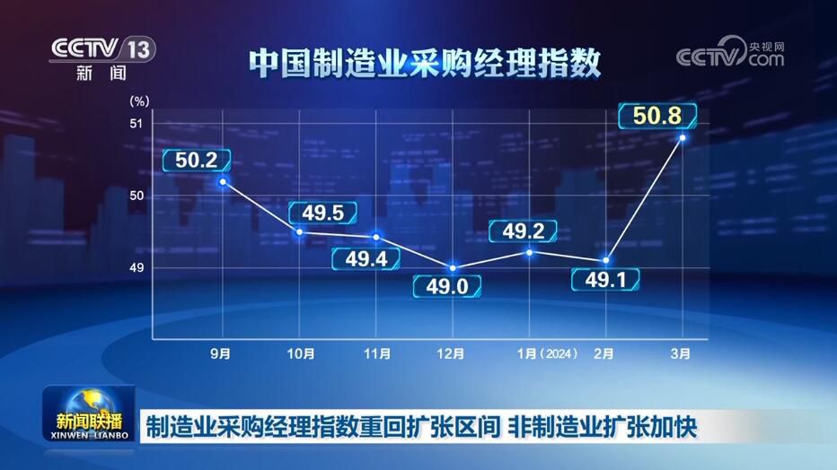 央視網(wǎng)消息:3月31日,《新聞聯(lián)播》報道了3月份中國采購經(jīng)理指數(shù)、各地重大工程建設,以及生態(tài)保護、春耕等領域取得的新成績、新成果,各行各業(yè)奮力拼搏,匯聚成向上的蓬勃力量,繪就出中國經(jīng)濟萬千氣象。