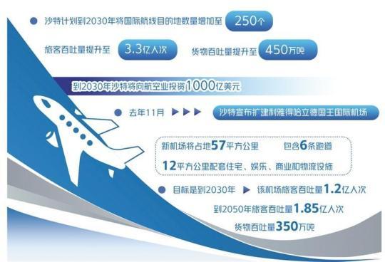 沙特航空戰(zhàn)略計劃建設以利雅得和吉達為全球鏈接樞紐的機場網(wǎng)絡。去年11月,沙特宣布將利雅得哈立德國王國際機場擴建成為世界最大機場之一,并改名為薩勒曼國王國際機場。根據(jù)規(guī)劃,新機場將占地57平方公里,包含6條跑道,12平方公里的配套住宅、娛樂、商業(yè)和物流設施,以及當前機場中已有的航站樓。其目標是到2030年,該機場旅客吞吐量達1.2億人次,到2050年旅客吞吐量達1.85億人次,貨物吞吐量達350萬噸。