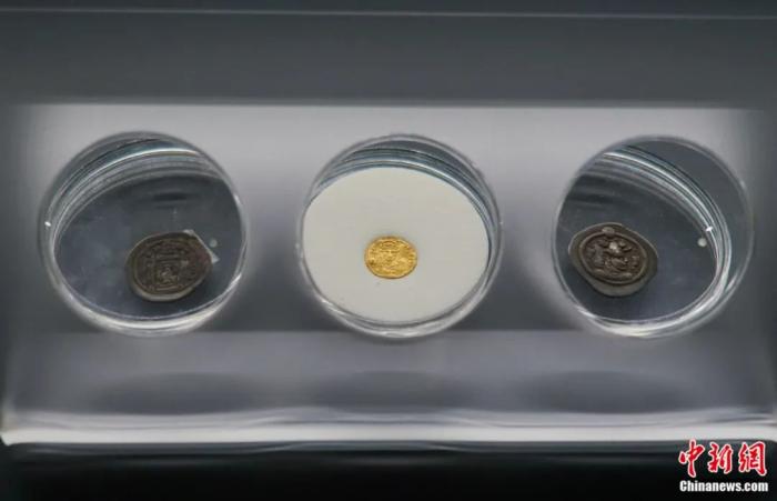青海省博物館藏、南北朝時期的波斯薩珊朝銀幣(兩側(cè) 西寧隍廟街出土)和羅馬金幣(中 都蘭縣香日德出土)。中新社記者 馬銘言 攝