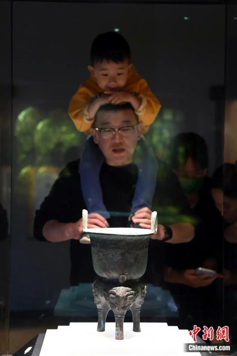 2023年4月29日,“五一”假期首日,一名小朋友在家長的陪同下來到位于甘肅省蘭州市的甘肅省博物館參觀展出的西周獸面紋銅甗。九美旦增 攝
