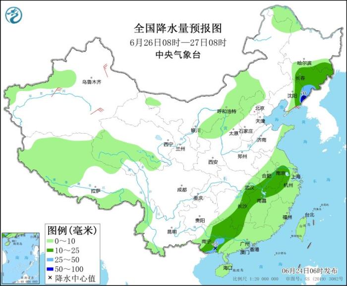 6月26日08時至27日08時,吉林中東部、遼寧東北部、蘇皖南部、浙江西部、江西北部、湖南東部和南部、廣西大部等地有中到大雨,局地暴雨(50~70毫米)。