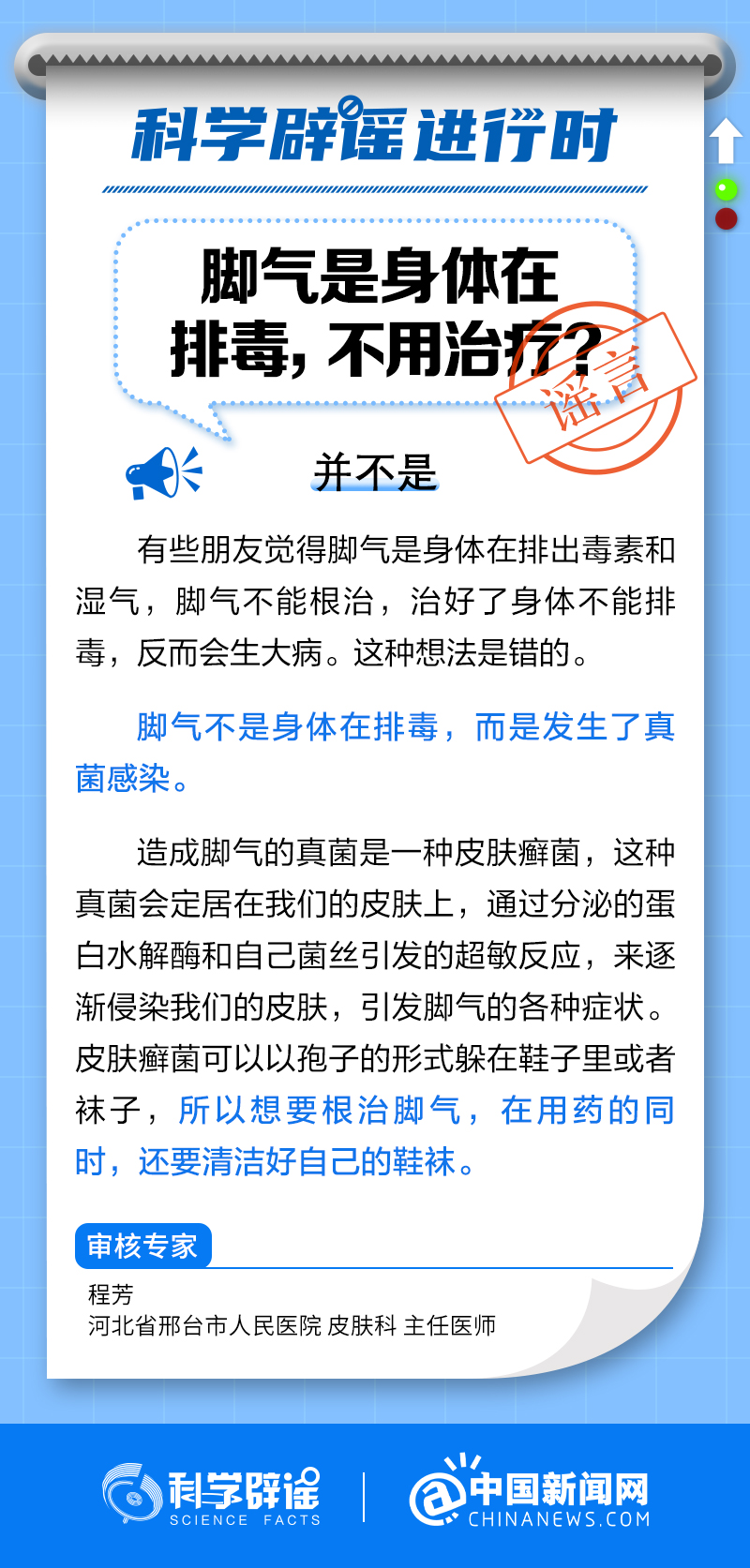 有些朋友覺得腳氣是身體在排出毒素和濕氣,腳氣治好了身體不能排毒,反而會(huì)生大病。這種想法是錯(cuò)的!腳氣不是身體在排毒,而是發(fā)生了真菌感染。(來(lái)源:@科學(xué)辟謠 @中國(guó)新聞網(wǎng) )