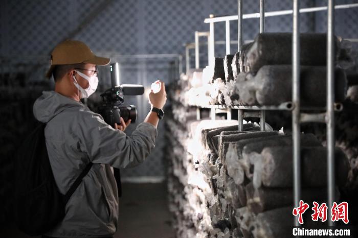 7月17日,甘肅省古浪縣,參加“絲路風(fēng)采 如意甘肅”聯(lián)合采訪活動(dòng)的兩岸及香港記者在當(dāng)?shù)仞B(yǎng)菌出菇的冷庫內(nèi)采訪拍攝。 中新社記者 李雪峰 攝