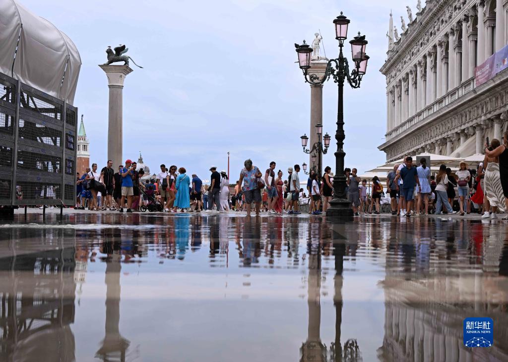 8月4日,游客走在意大利威尼斯積水的道路上。