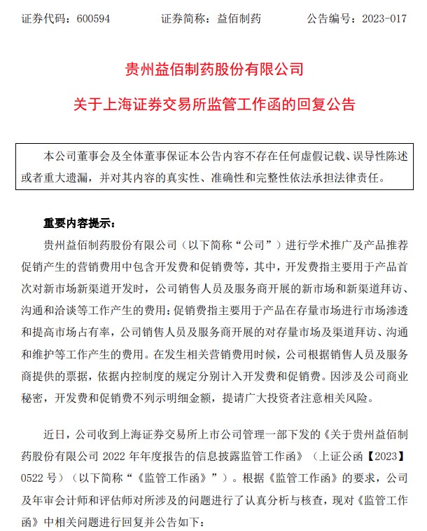 2023年6月,益佰制藥收到上交所年報監(jiān)管函,被要求補(bǔ)充披露銷售費用前五大支付對象;學(xué)術(shù)推廣、營銷平臺建設(shè)等市場費用主要核算內(nèi)容明細(xì)情況;銷售費用支付對象中是否涉及公司經(jīng)銷商、關(guān)聯(lián)方或其他利益相關(guān)方等相關(guān)信息。