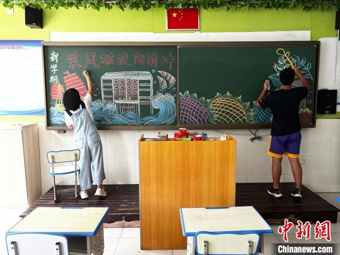 在一間教室里,來自夏村中學的教師丁玲正帶著學生徐俊熙繪制迎接新生的黑板報,有大船、海浪、向日葵等圖案。徐俊熙開學上初二,他對記者說:“這個黑板報的主題‘乘風破浪向前沖’,是為了激勵同學們要堅強起來,不畏困難,積極向上?!?/p>