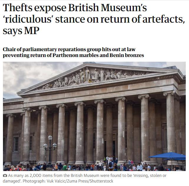 中新網8月28日電 據英國《衛(wèi)報》當地時間27日報道,對于近期大英博物館館藏被盜事件,一名英國議員表示,該事件暴露了大英博物館以安全為由,拒絕將有爭議文物歸還原籍國的借口“荒謬”且“具有侮辱性”。