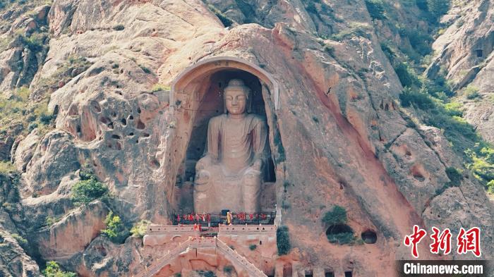 據(jù)悉,須彌山石窟始鑿于北魏孝文帝太和年間,現(xiàn)存洞窟162座,造像1000余軀,壁畫200多平方米,碑刻16方,漢藏西夏文題記53處,分布在4平方公里的五座大山崖面上。作為須彌山石窟的“名片”,第5窟唐代彌勒大佛坐像鑿于紅砂巖質(zhì)山體之上,高達(dá)20.6米,儀態(tài)威嚴(yán)、神情端莊,帛帶袈裟、面龐豐腴,造像氣勢(shì)宏偉,雕鑿技藝嫻熟。