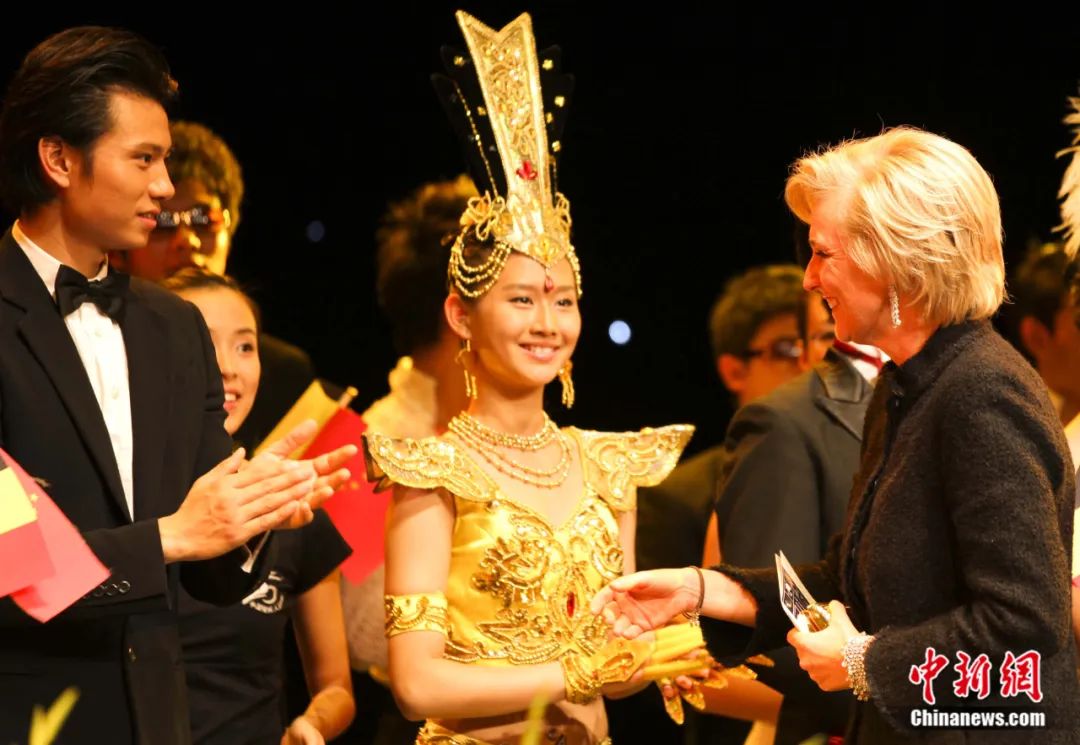 2011年9月,比利時公主阿斯特里德(右)在布魯塞爾觀看中國殘疾人藝術(shù)團傾情奉獻的演出——《我的夢》。圖為阿斯特里德公主向演員致謝。沈晨 攝