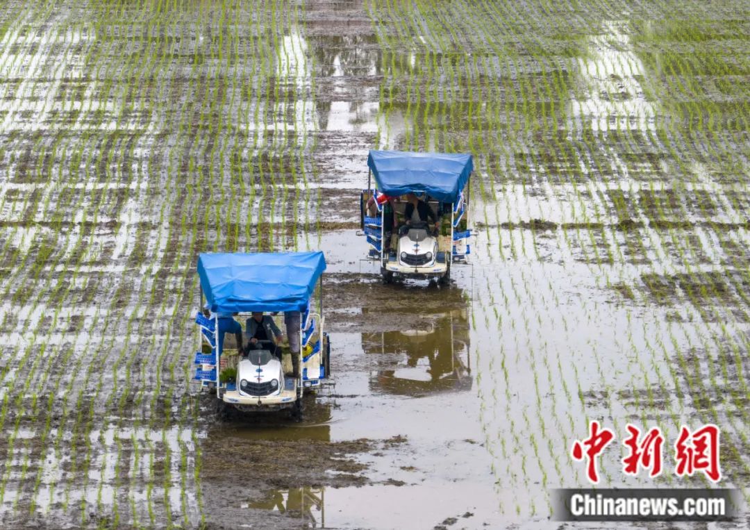 村民駕駛插秧機在江蘇省泰州市顧高鎮(zhèn)塘橋村栽插水稻秧苗。湯德宏 攝