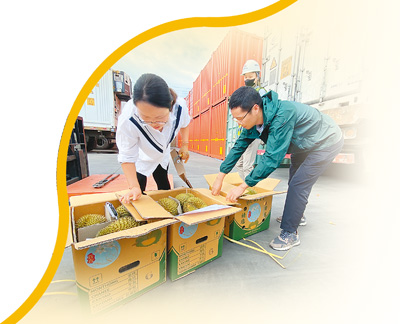 核查貨證、抽樣開(kāi)箱、剖果檢查……黃中磊和同事劉奇開(kāi)始按流程查驗(yàn)?!皺z查病媒及有害生物,未見(jiàn)異常;檢查包裝,未見(jiàn)異常;核對(duì)品名,未見(jiàn)異常;檢查標(biāo)簽標(biāo)識(shí),未見(jiàn)異?!苯?jīng)過(guò)認(rèn)真查驗(yàn),兩人確認(rèn)這批榴蓮查驗(yàn)合格,可以出證放行。