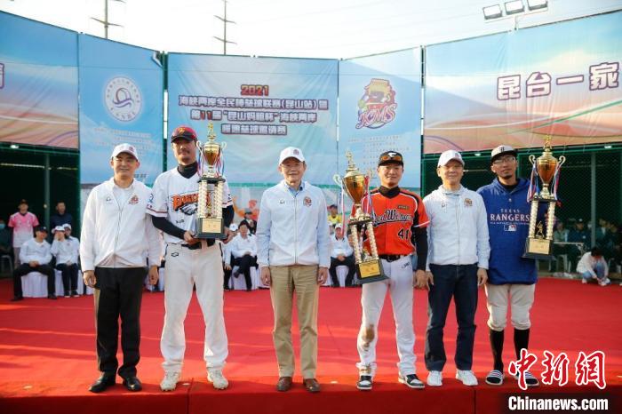 “昆山媽祖杯”海峽兩岸慢速壘球邀請(qǐng)賽已成為昆山的代表性體育賽事。圖為2021年10月24日,嘉賓在閉幕式上為獲得競技組前三名的球隊(duì)頒獎(jiǎng)并合影。中新社記者 王駿 攝