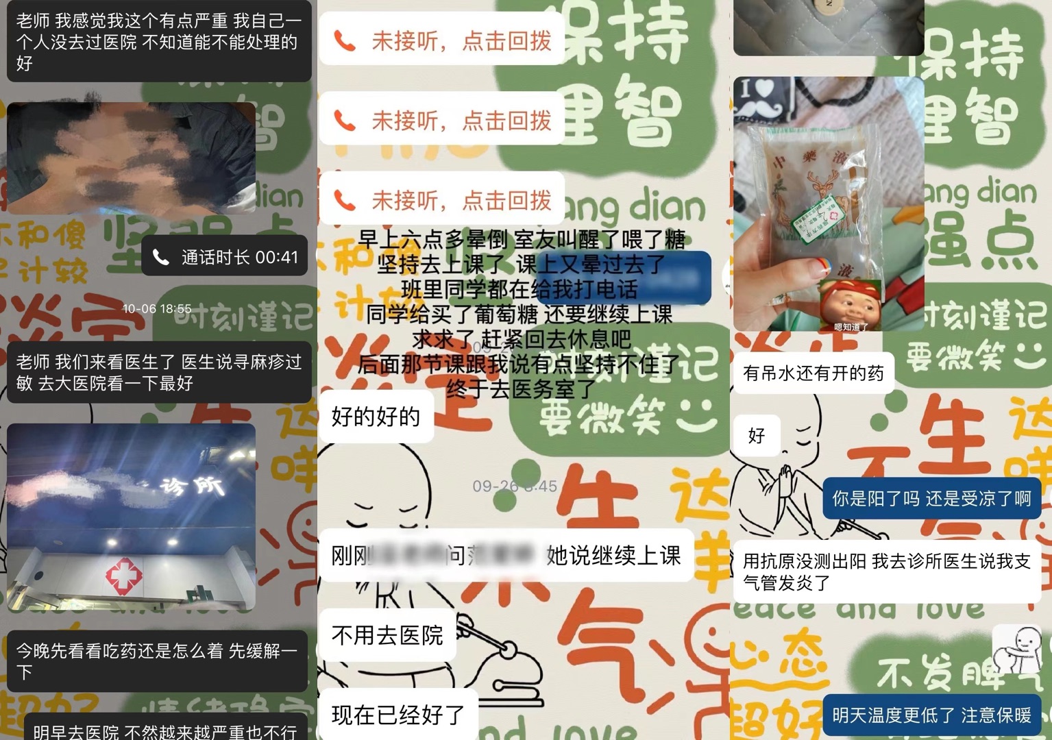 “因為我?guī)У膶W(xué)生基數(shù)較大,三百多人,每周基本上都會有十幾個因生病請假的學(xué)生?!?阿宛向中新網(wǎng)介紹,生病的學(xué)生中,最常見的是感冒發(fā)燒、胃疼等情況,也有一些突發(fā)狀況,比如“著急下樓收衣服結(jié)果被垃圾車刮到,半夜嘔吐到進醫(yī)院,低血糖在課上暈倒”等。