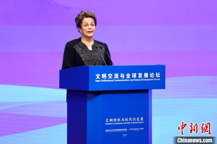 11月7日,由中共中央黨校(國(guó)家行政學(xué)院)主辦的文明交流與全球發(fā)展論壇在京開(kāi)幕。圖為新開(kāi)發(fā)銀行行長(zhǎng)羅塞夫作主旨演講。富田 攝