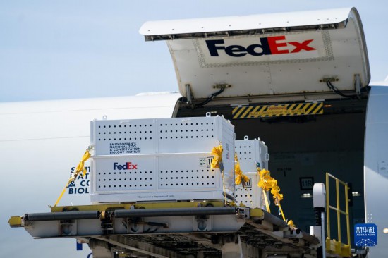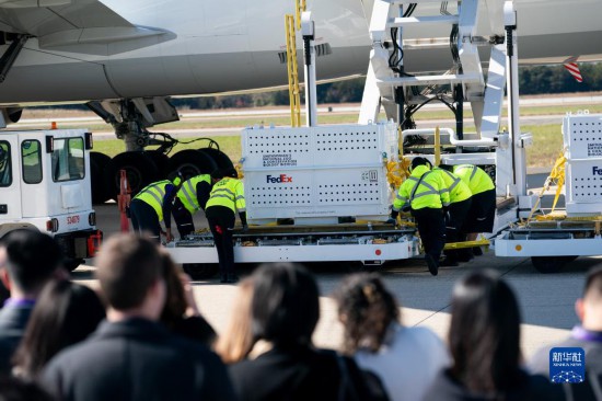 11月8日,在美國弗吉尼亞州的華盛頓杜勒斯國際機(jī)場,裝有大熊貓的特制“旅行包廂”運上專機(jī)。新華社記者劉杰攝