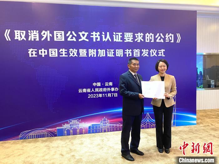 中新網(wǎng)昆明11月7日電 (陳靜)《取消外國公文書認(rèn)證要求的公約》(下稱《公約》)7日在中國生效實(shí)施。當(dāng)日,云南省政府外事辦公室主任楊沐向云南省公證協(xié)會(huì)會(huì)長周海春頒發(fā)了全省首張附加證明書。