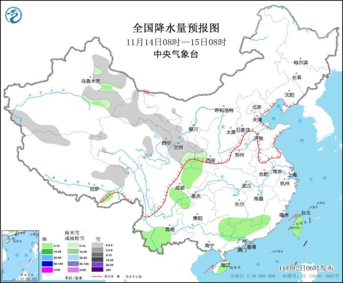 11月13日08時(shí)至14日08時(shí),新疆北部等地部分地區(qū)有小到中雪或雨夾雪,局地大到暴雪(10~12毫米)。湖南南部、四川盆地、貴州南部和東部、云南大部、廣西、廣東北部、海南島、臺(tái)灣島等地部分地區(qū)有小到中雨,其中,云南中部局地有大雨(25~45毫米)。東海南部、臺(tái)灣海峽、臺(tái)灣以東洋面、巴士海峽、南海北部和中部、北部灣、瓊州海峽將有7~8級(jí)、陣風(fēng)9級(jí)的大風(fēng)。