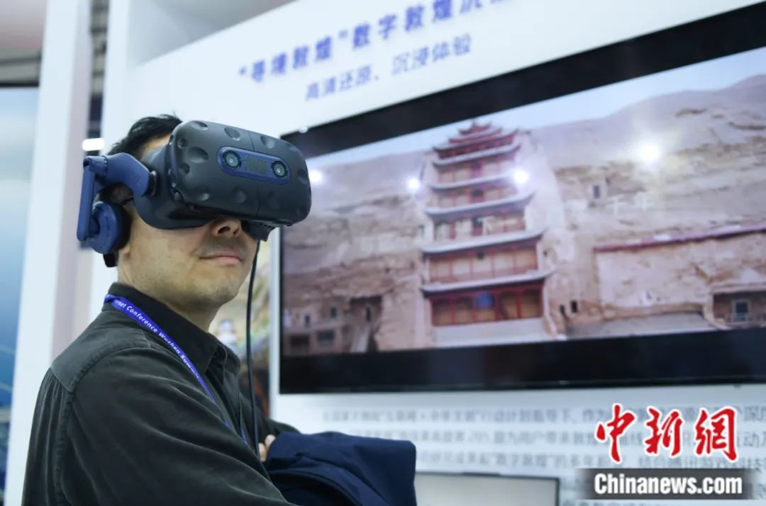 2023年世界互聯(lián)網(wǎng)大會“互聯(lián)網(wǎng)之光”博覽會上,一位參觀者使用VR眼鏡體驗(yàn)數(shù)字敦煌。王剛 攝