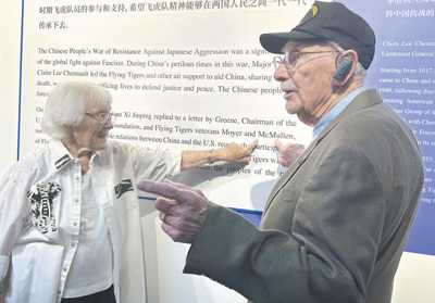 走進博物館,代表團成員在一張張老照片、一件件珍貴實物前流連,認真聆聽講解,還不時與身邊親友交談。麥克馬倫在展板上看到自己的名字后,興奮地向妻子珍妮弗指了指名字的位置。他曾擔任B—24轟炸機機頭炮手和助理飛行機械師,在昆明和成都參加對日作戰(zhàn)??粗AЧ窭锏恼蛊罚锌骸懊乐袃蓢嗣竦挠颜x將延綿不斷?!?/p>