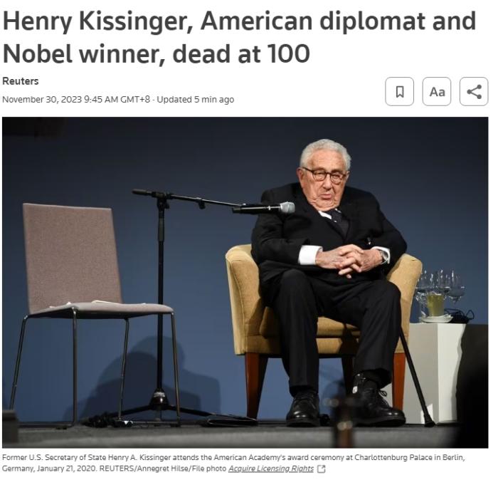 中新網(wǎng)11月30日電 據(jù)基辛格協(xié)會的消息,當?shù)貢r間11月29日,美國前國務卿基辛格在其位于康涅狄格州的家中去世,享年100歲。
