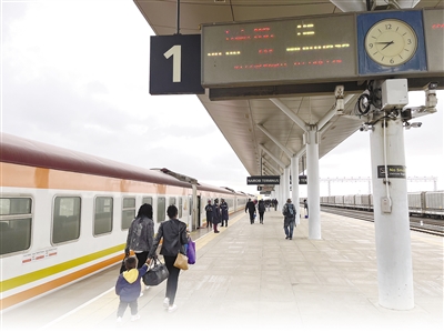 由中國(guó)路橋工程有限責(zé)任公司承建的蒙內(nèi)鐵路是肯尼亞獨(dú)立以來建設(shè)的首條鐵路,也是一條采用中國(guó)標(biāo)準(zhǔn)、中國(guó)技術(shù)、中國(guó)裝備建造的現(xiàn)代化鐵路,被譽(yù)為中國(guó)和肯尼亞共建“一帶一路”標(biāo)志性工程。圖為蒙內(nèi)鐵路列車停靠在內(nèi)羅畢站。