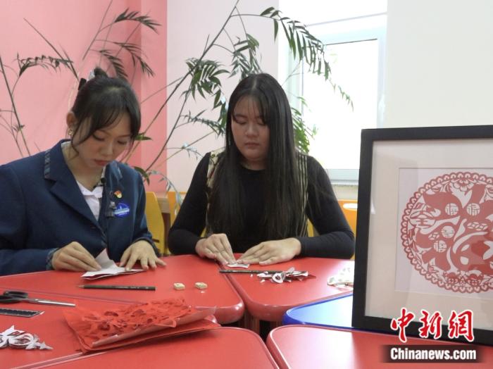蘇慧娜與中國學(xué)生一同剪紙。呂盛楠攝