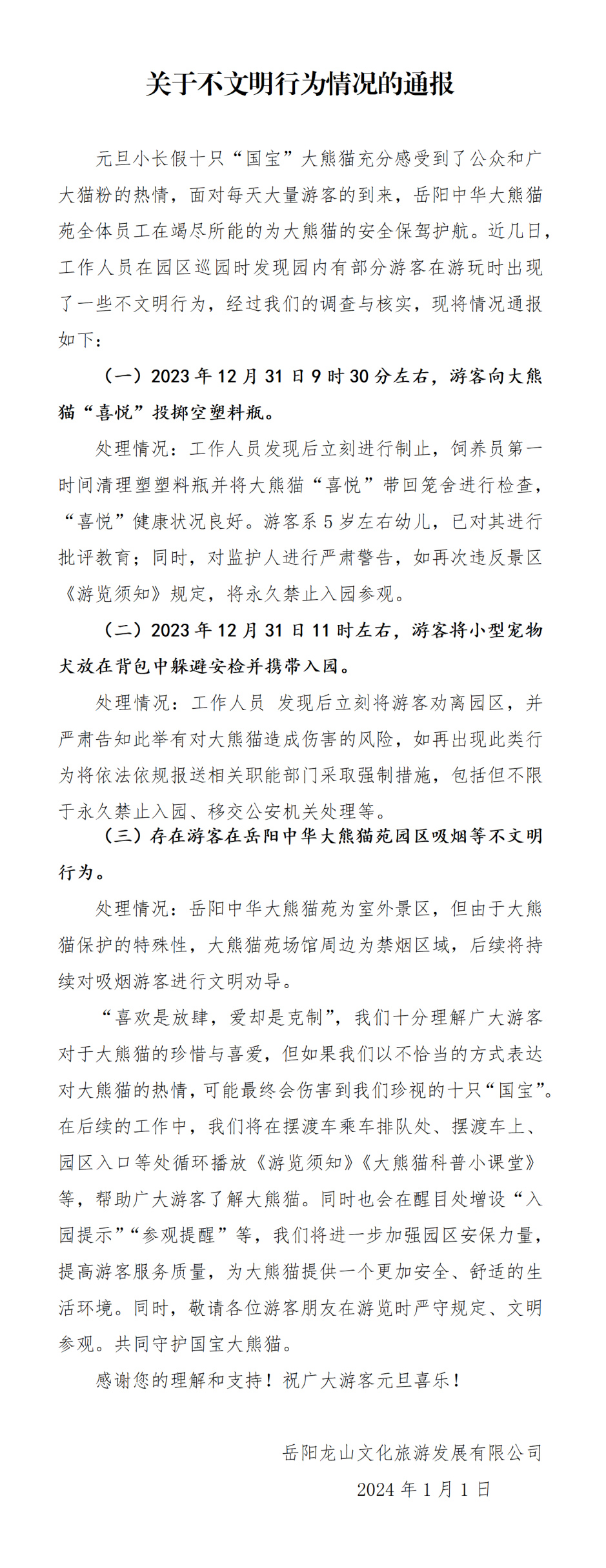 中新網(wǎng)1月2日電 據(jù)湖南省岳陽(yáng)市南湖動(dòng)物園有限公司官方微信消息,近幾日,工作人員在園區(qū)巡園時(shí)發(fā)現(xiàn)園內(nèi)有部分游客在游玩時(shí)出現(xiàn)了一些不文明行為,2023年12月31日9時(shí)30分左右,有游客向大熊貓“喜悅”投擲空塑料瓶。