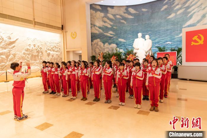 隨后,天津市川府里小學(xué)學(xué)生為大家?guī)砭世收b《為中華之崛起而讀書》,再現(xiàn)了周恩來青年時代在奉天(今沈陽)東關(guān)模范學(xué)校上學(xué)時立下的宏偉志向。伴隨著《紅星閃閃》的嘹亮歌曲,新時代少年立下了“故今日之責(zé)任,不在他人,而全在我少年。少年智則國智,少年富則國富,少年強則國強.......”的鏗鏘誓言。