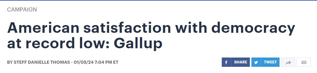 中國日報網(wǎng)1月8日電 據(jù)美國《國會山報》網(wǎng)站5日報道,蓋洛普公司(Gallup)5日公布的民調(diào)顯示,只有28%的美國成年人對該國的民主現(xiàn)狀感到滿意,較2021年1月6日美國“國會山騷亂”事件發(fā)生后不久的35%的調(diào)查結(jié)果又有了明顯的下降,創(chuàng)歷史新低。