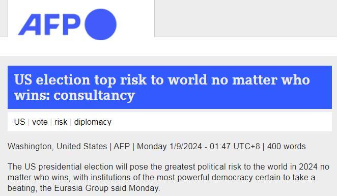 中新網1月10日電 據法新社報道,日前,政治風險咨詢公司歐亞集團表示,無論誰獲勝,2024年美國總統選舉都將給世界帶來最大政治風險,美國制度將會受到打擊。