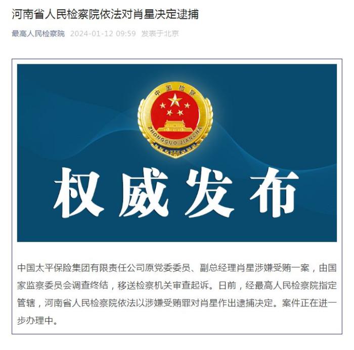 中新網(wǎng)1月12日電 據(jù)最高人民檢察院微信公眾號消息,中國太平保險集團有限責任公司原黨委委員、副總經(jīng)理肖星涉嫌受賄一案,由國家監(jiān)察委員會調(diào)查終結,移送檢察機關審查起訴。日前,經(jīng)最高人民檢察院指定管轄,河南省人民檢察院依法以涉嫌受賄罪對肖星作出逮捕決定。案件正在進一步辦理中。
