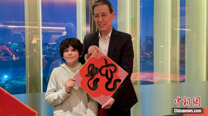 中國(guó)書法家修先臺(tái)先生向法國(guó)小男孩贈(zèng)送書法作品。中新網(wǎng)黃方攝
