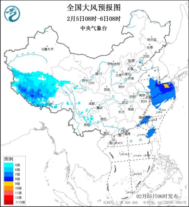 中央氣象臺2月5日06時繼續(xù)發(fā)布大風(fēng)藍(lán)色預(yù)警:預(yù)計(jì),2月5日08時至6日08時,西藏中西部、青海西南部等地將有5~7級、陣風(fēng)8級的大風(fēng);黃海南部海域、東海大部海域、臺灣海峽、巴士海峽將有7~8級、陣風(fēng)9級的大風(fēng),其中黃海東南部、東海東北部的部分海域風(fēng)力可達(dá)9級、陣風(fēng)10級。