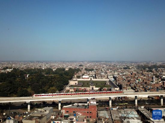 2月2日,在巴基斯坦拉合爾,橙線地鐵列車途徑當(dāng)?shù)赜斡[勝地夏利瑪花園。新華社發(fā)(艾哈邁德·卡邁勒攝)