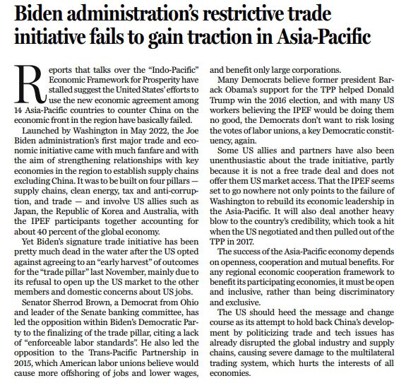 如今美國的一些盟友及伙伴也開始對IPEF失去了熱情,部分原因在于該框架并非自由貿(mào)易協(xié)定,也沒有提供給他們進入美國市場的機會。IPEF似乎已經(jīng)是“窮途末路”,它的處境,映證的是美國在重塑亞太地區(qū)經(jīng)濟領(lǐng)導力方面的失敗,也令美國自2017年退出TPP后再次“信譽掃地”。