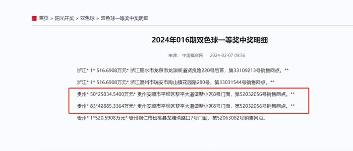 記者致電貴州省福利彩票發(fā)行中心,相關工作人員表示,在貴州的134注一等獎中,133注為同一銷售網(wǎng)點銷售,由兩張彩票組成。銷售網(wǎng)點的地址為貴州安順市平壩區(qū)黎平大道堡墅小區(qū)8號門面,編號為第52032056號。
