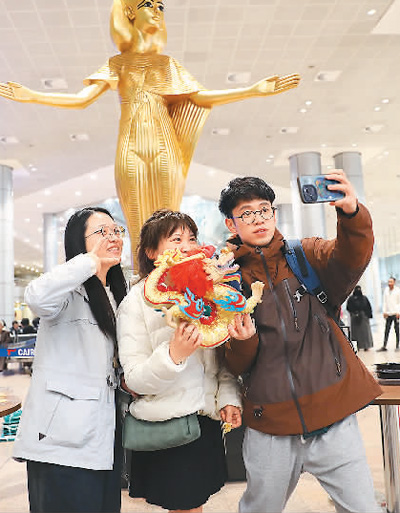 中國(guó)游客在埃及開羅國(guó)際機(jī)場(chǎng)舉行的“歡迎中國(guó)游客來埃及過大年”儀式上合影。